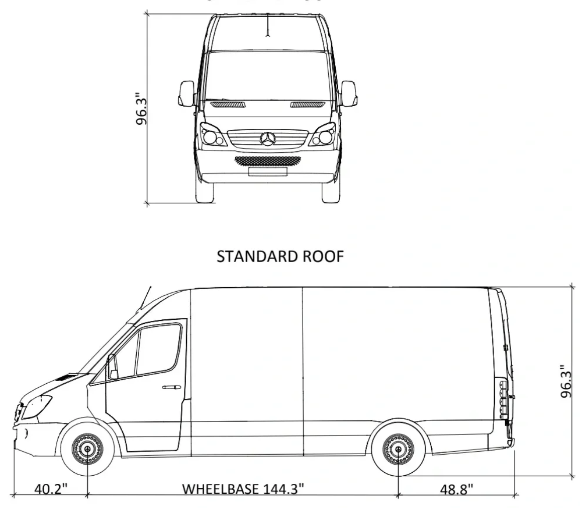 - 152 square feet of space on either a 144 wheel-based Mercedes Sprinter, or a High-roof Ford Transit